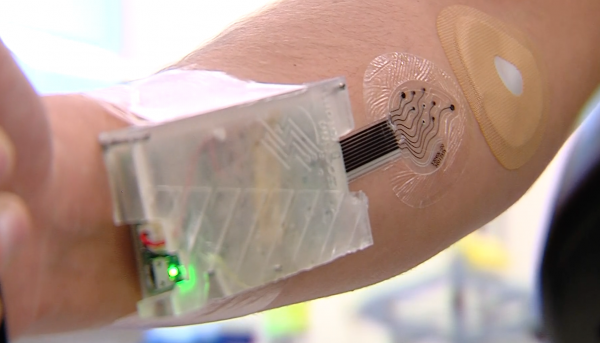 Eccrine Systems’ “sweatronics” platform uses a disposable patch to analyze sweat to measure stress levels, electrolytes, and more.