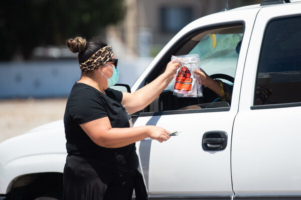 A patient is handed a test kit at a Covid-19 testing site in Panorama City. Photo credit: Los Angeles County
