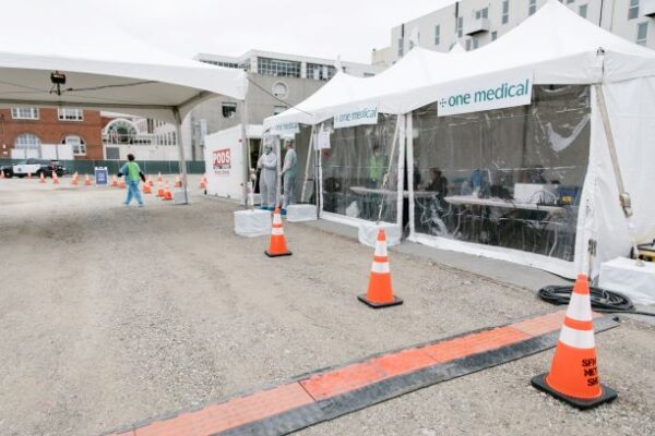 Providers administer Covid-19 tests at a drive-thru testing site run by One Medical in San Francisco. The county stopped sending vaccine doses to One Medical in February after reports that it had been letting ineligible patients get vaccines ahead of healthcare workers. Photo credit: One Medical